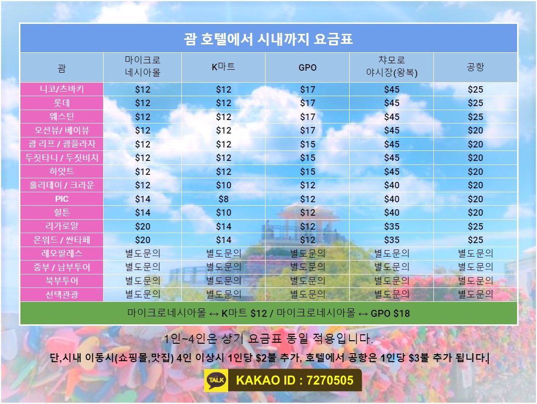 호텔에서 쇼핑몰이나 맛집 그리고 개별적으로 공항 출국시 괌 택시비는 위에 요금표와 다릅니다. 이전과 조금 수정이 되기는 했는데요. 그러다보니 괌호텔에서 공항까지 샌딩요금을 보시고 택시예약을 하시면 안됩니다.